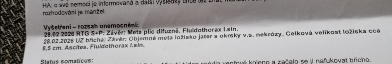 Moje sestra má velké zdravotní problémy - primárně pokročilá rakovina tlustého střeva, ascites na játrech o velikosti 8,5cm, meta játra a plíce, co 14 musí absolvovat punkci cca 4,5l tekutiny, strašně zhubla, je bez života, jen v bolestech, prosím dalo by se s jejím zdravotním stavem ještě nějak pracovat ?